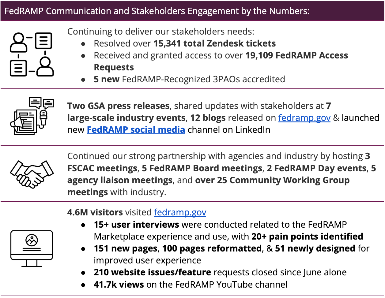 Industry trade associations that actively support FedRAMP by organizing FedRAMP-focused events, responding to public comment, and treating FedRAMP like an active partner will continue to have priority access to the FedRAMP Director and team for honest updates at events and working sessions.