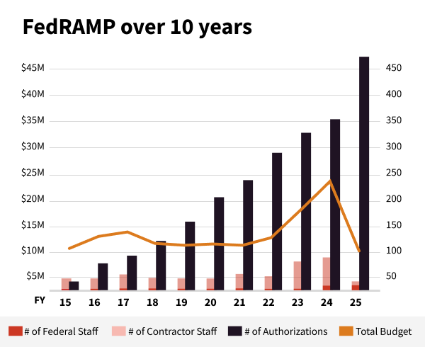 FedRAMP was a program operating in crisis at the beginning of FY25. Final authorization times were exceeding one year and at times approaching up to two years, the Joint Authorization Board (JAB) had shut down unexpectedly for nearly a year, years of promises for automation had failed to come to fruition, and only a little more than 350 cloud services had completed FedRAMP in 13 years. The goals, structure, and intent of the program of the first twelve years had just been rescinded and replaced by OMB Memorandum M-24-15 “Modernizing FedRAMP” without a clear path to achieve the updated vision and scope outlined in the new policy.
